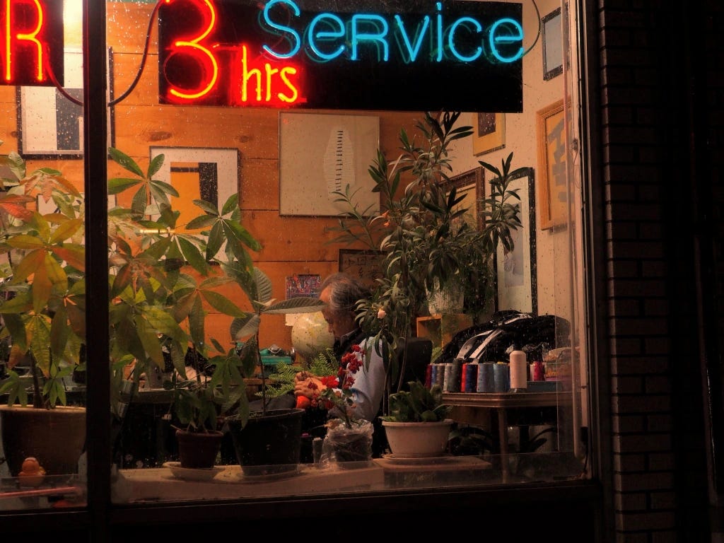 Street lamps at dusk & neon signs for ordinary things like Frank’s Shoe Repair gleaming red or Nettoyeur 3 hr Service in electric blue.
